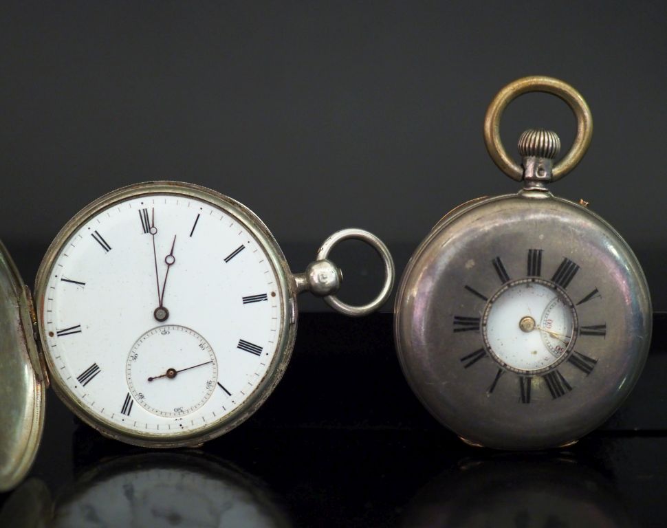 LEROY Fils Ensemble comprenant : - une montre savonnette aveugle en argent. Cadran à chiffres romains pour les heures. Compteurs pour les secondes à six heures. Signée. Diam. 45 mm Poids tel. 54,93 g - une montre de col en argent. Couvercle à chiffres romains émaillés noirs découvrant un cadran à chiffres romains pour les heures et arabes pour les minutes. Compteurs pour les secondes à six heures. Le revers, à décor de monogramme surmonté d'une couronne. Double fonds en argent. Diam. 42 mm Poids tel. 61 g (bélière en métal)