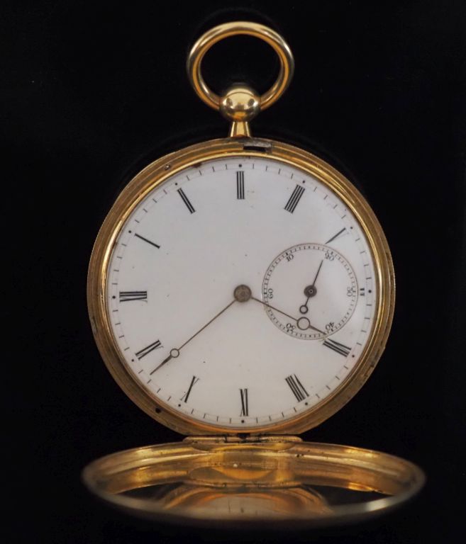 LEROY Fils, Paris Montre savonnette aveugle en or jaune 750. Cadran à chiffres romains pour les heures, chemin de fer pour les minutes. Compteur pour les secondes à 6h. Le couvercle, à décor gravé de fleurettes et de cartouche monogrammé. Double fonds en or jaune 750. Le revers, à décor de fleurs sur fond guilloché. Numérotée. Signée. Diam. 45 mm Poids tel. 58,93 g On y joint une clé de montre en or jaune 750. Poids tel. 3,87 g (accidentée)