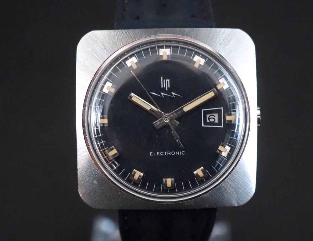 LIP, Electronic Montre bracelet à boitier carré en acier brossé. Cadran à fond bleu/noir à index appliqués et aiguilles luminescents. Guichet dateur à 3h. Bracelet cuir ajouré, boucle ardillon. Signée. Numérotée 000556. 36 x 36 mm