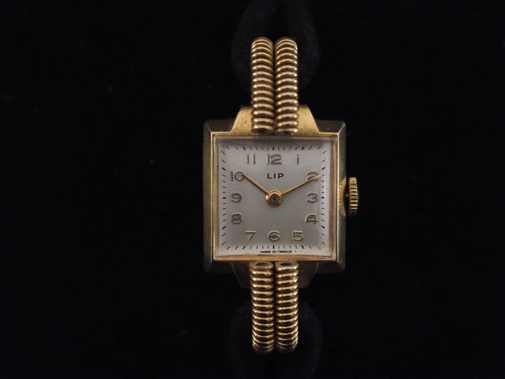 LIP Montre bracelet de dame de style 1940 en plaqué or. Cadran carré à chiffres rabes pour les heures et index bâtons pour les minutes. Le cadran agrémenté de part et d'autre de quatre motifs de ressorts. Bracelet cuir et velours noir, boucle ardillon. Mouvement mécanique. Signée. 18 x 18 mm