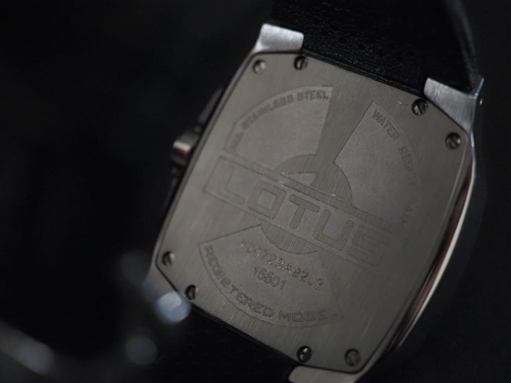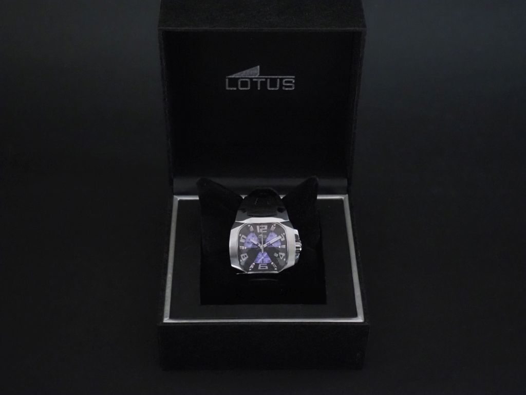 LOTUS Ref. 15501 Montre bracelet en acier. Cadran à trois compteurs violets, chiggres arabes, index appliqués et aiguilles luminescents. Bracelet cuir noir, coutures violettes, boucle déployante. Fond vissé. Signée. 32 x 40 cm Dans sa boite, avec son certificat de garantie internationale.