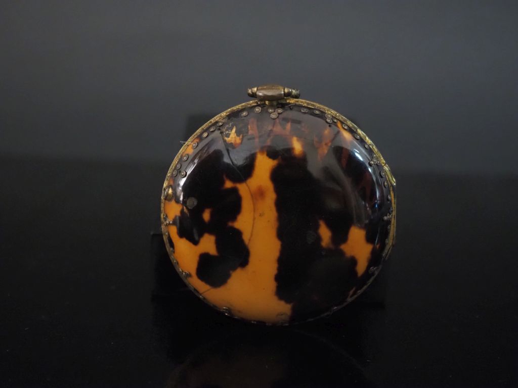 MARKWICK, MARKHAM, PERIGAL, London Fin XVIIIe siècle Montre de poche pour le marché Ottoman à triple boitiers en écaille de tortue piquée et métal doré. Boîtier : rond sur charnière, le boîtier intérieur avec dos lisse avec carré de remontage est accompagné d’un double boîtier de protection (usures) Cadran : émail blanc avec chiffres turcs pour l’indication des heures et minutes, minuterie chemin de fer, signé « Markwick Markham Perigal London » Mouvement : mécanique avec remontage à clef, coq ciselé et percé a un seul pilier de style anglais, échappement à verge, balancier spiral, disque de réglage, signature sur la platine « Markwick Markham Perigal London » Diam. 65 mm, 55 mm et 47 mm Poids tel. 174 g (petits accidents) Expert : Geoffroy Ader - Ader Watches