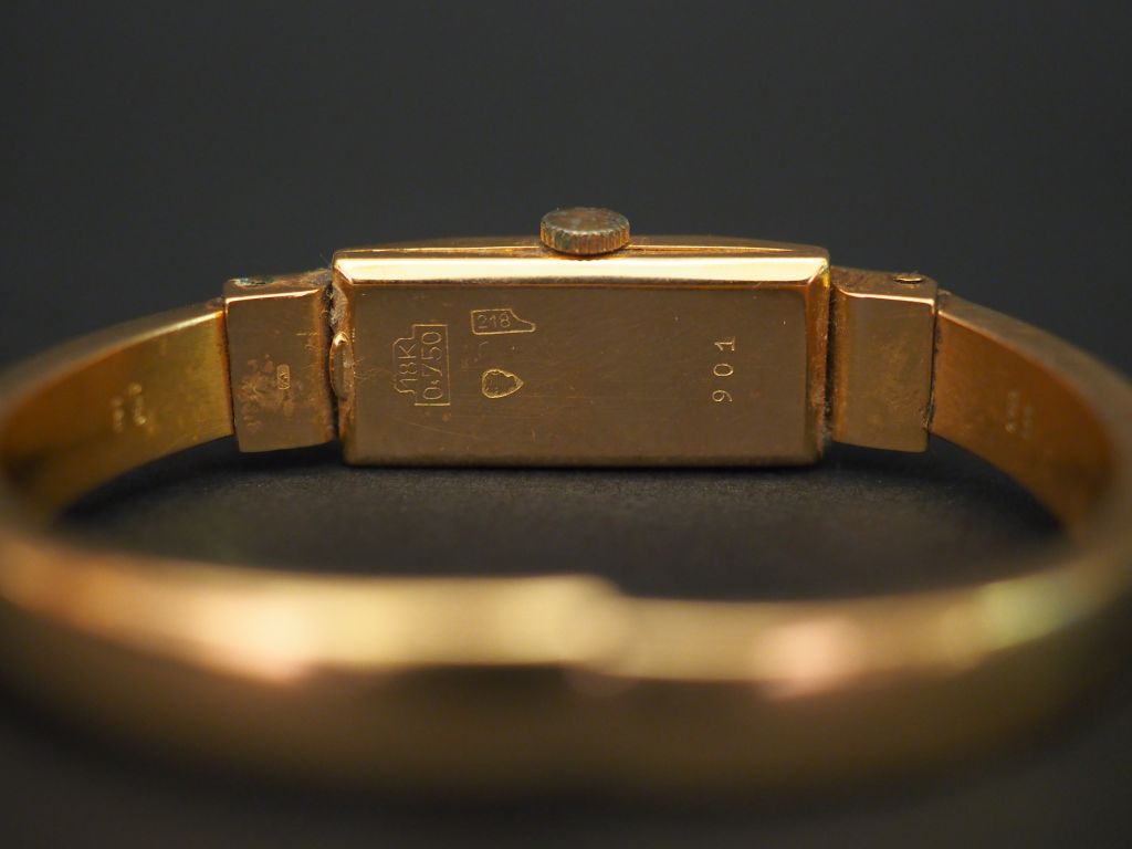 Montre bracelet de dame, boitier et bracelet en or jaune. Cadran rectangulaire à chiffres arabes et pastilles pour les heures. Bracelet jonc. Poids tel. 15,36 g (usures au cadran)