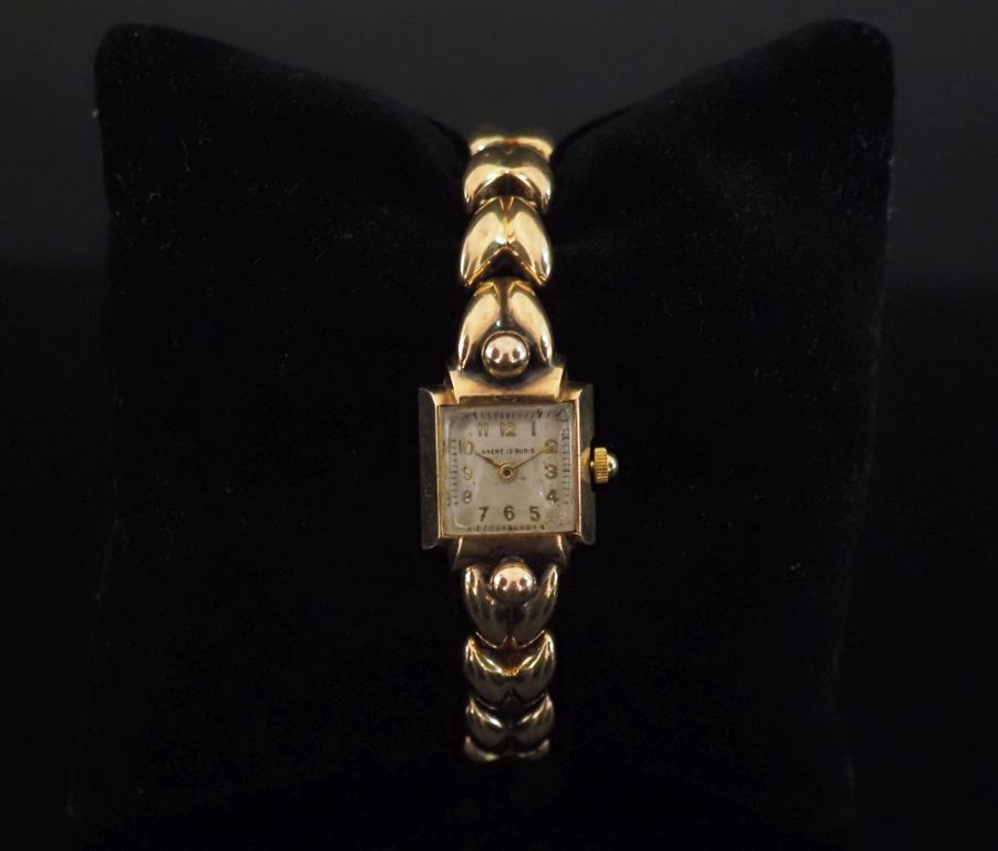 Montre bracelet de dame de style 1940, boitier et bracelet en or jaune 750. Cadran à chiffres arabes pour les heures. Bracelet articulé, maille épis. Chainette de sécurité en or jaune 750. 16 x 16 mm Poids tel. 27,62 g