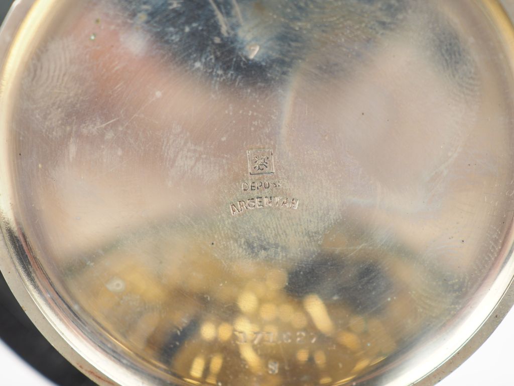 MONTRE DE BORD en métal argenté, cadran émail avec chiffres arabes et petite trotteuse, minuterie externe, mouvement mécanique à remontage manuel, réserve de marche 8 jours. Écrin de protection en cuir noir. Diam. 60 mm Expert : Geoffroy Ader