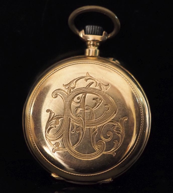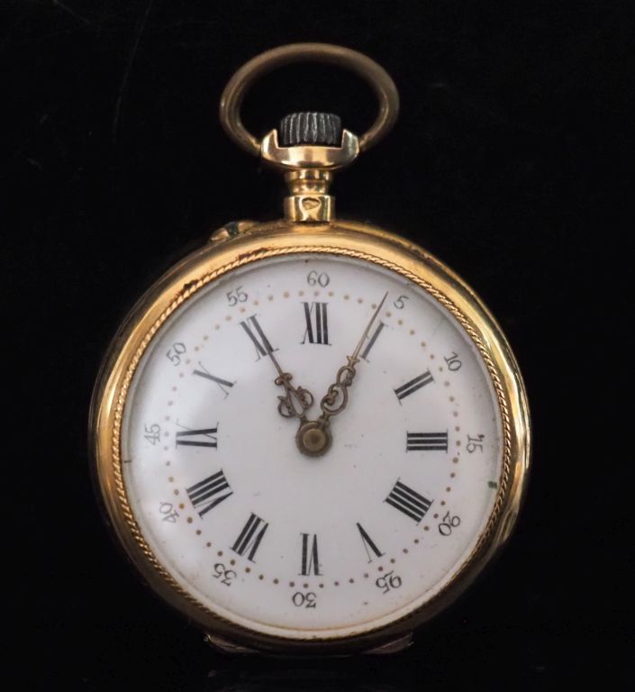 Montre de col en or jaune 750. Cadran à chiffres romains pour les heures et arabes pour les minutes. Le revers, à décor de monogramme feuillagé. Double fonds en or jaune 750. Diam. 32 mm Poids tel. 24,31 g (bélière et couronne de remontoir en métal)