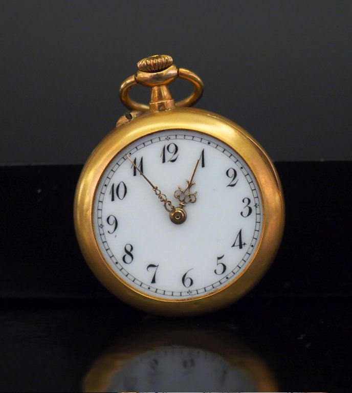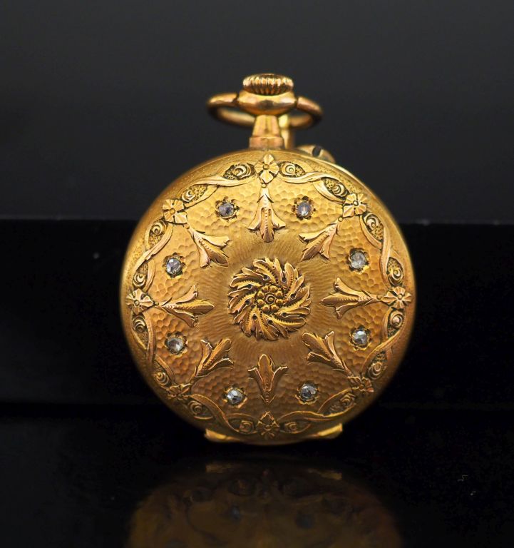 Montre de col en or jaune. Cadran à chiffres arabes pour les heures. Le revers, à décor de fleurons, fleurs et entrelacs agrémenté de petits diamants taillés en rose. Double fonds en or. Diam. 30 mm Poids tel. 19,71 g (manque le verre)