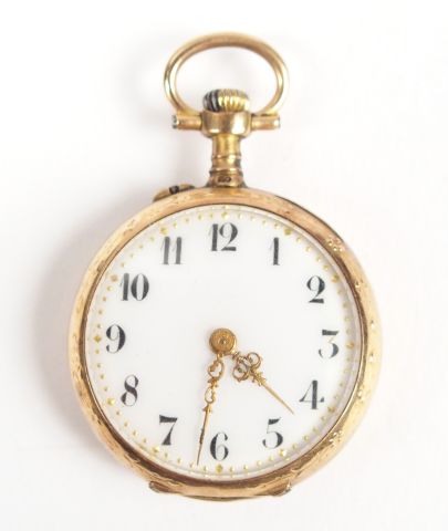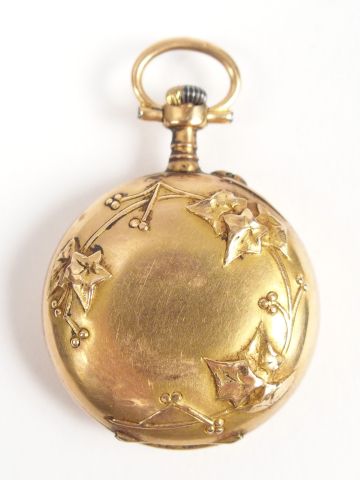 Montre de col en or jaune, cadran émail, chiffres arabes, décor gravé de feuilles de houx. Diam. : 25mm Poids tel: 14,4gr