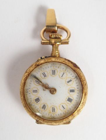 Montre de col en or jaune, cadran émail, chiffres romains, décor d'arabesques. Poids tel: 14,2gr