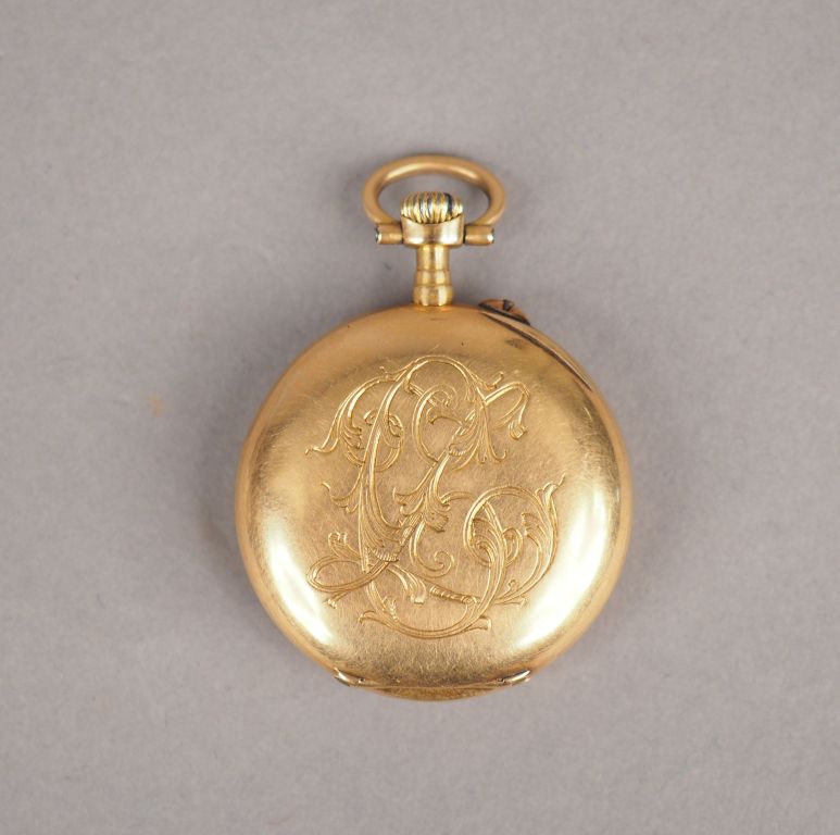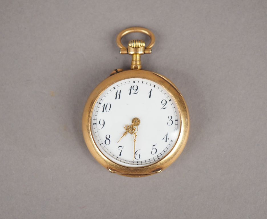 Montre de col en or jaune, cadran émaillé, chiffres arabes. Le revers à décor de monogramme. Diam. 25 mm Poids tel (sans le verre). 19,17 g (verre à refixer)
