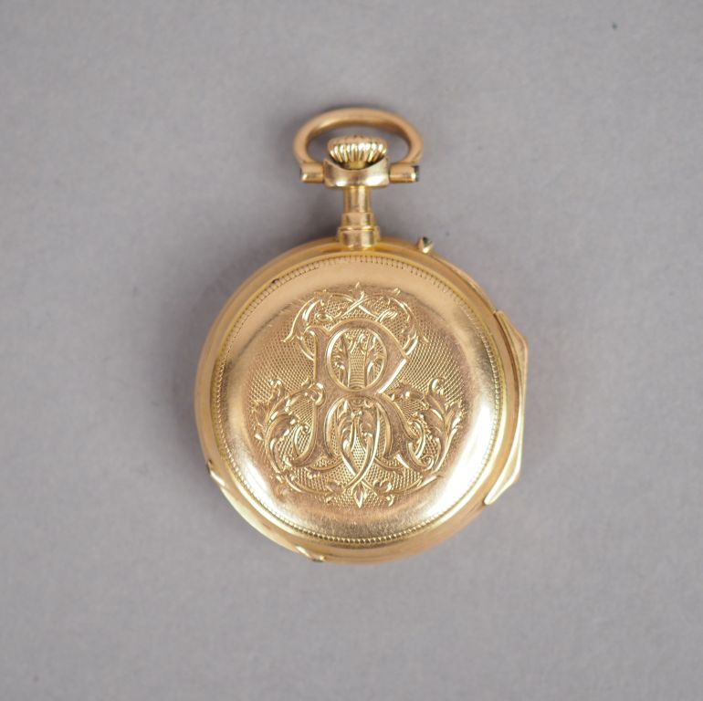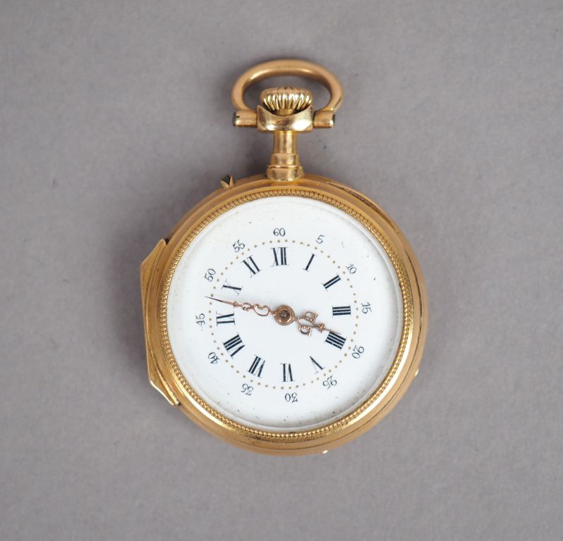 Montre de col en or jaune, cadran émaillé, chiffres romains. Le revers, à décor de monogramme. Poids tel. 30,88 g
