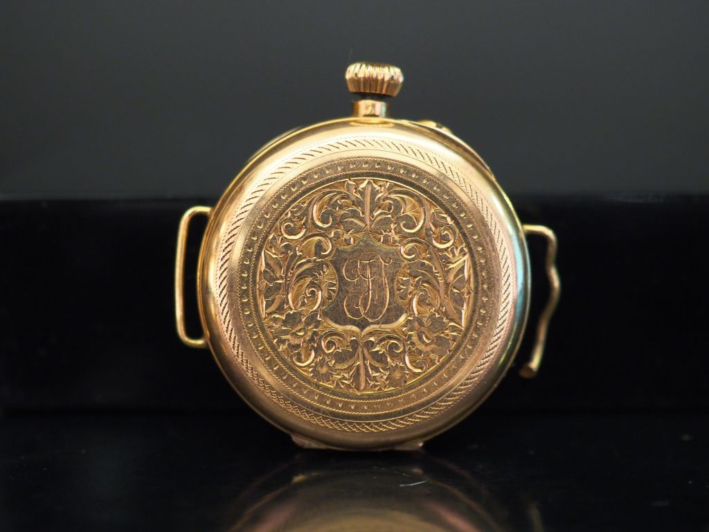 Montre de col en or jaune, tranformée en montre bracelet. Cadran à chiffres romains pour les heures et arabes pour les minutes. Le revers, à décor de cartouche monogrammé et de rinceaux. Double fonds en or jaune. Diam. 30 mm Poids tel. 18,65 g (accidents)