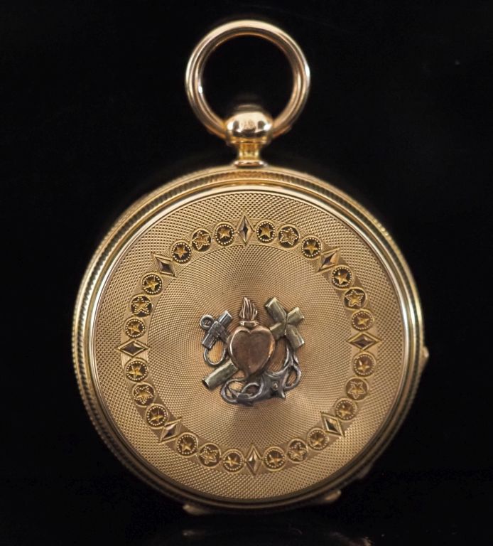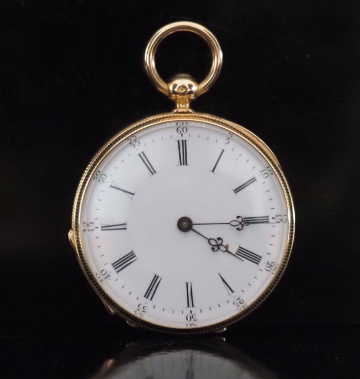 Montre de col Napoléon III en or jaune 750. Cadra à chiffres romains pour les heures et arabes pour les minutes. Double fonds en or jaune 750. Le revers, à décor de trophée appliqué et de frise de motifs géométriques. Diam. 35mm Poids tel. sans le verre : 25,54 g
