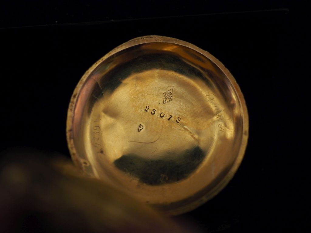Montre de col Napoléon III en or jaune 750. Cadran à chiffres romains pour les heures. Le revers, à décor de cartouche, fleurs et feuillage. Le pourtour, à décor gravé de rinceaux, feuillage et fleurettes. Double fonds en or jaune 750. Diam. 29 mm Poids tel. 18,32 g