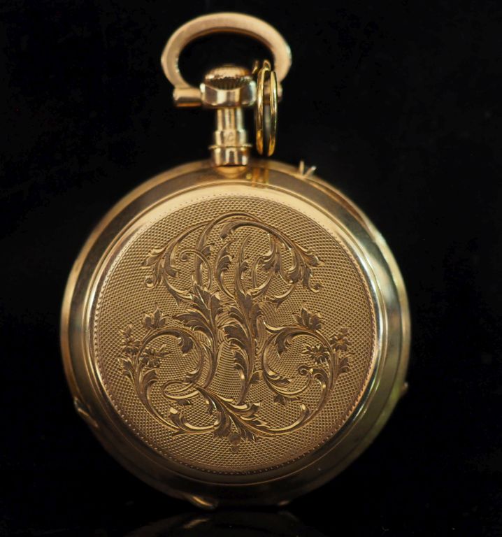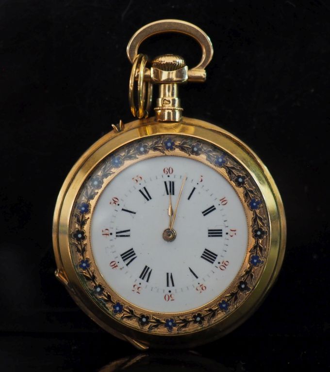 Montre de col Napoléon III en or jaune 750. Cadran à chiffres romains pour les heures et arabes pour les minutes. Joli pourtour, à décor d'une guirlande fleurs émaillée. Le revers, à décor de monogramme feuillagé sur fond guilloché. Double fonds en or jaune 750. Diam. 34 mm Poids tel. 28,33 g