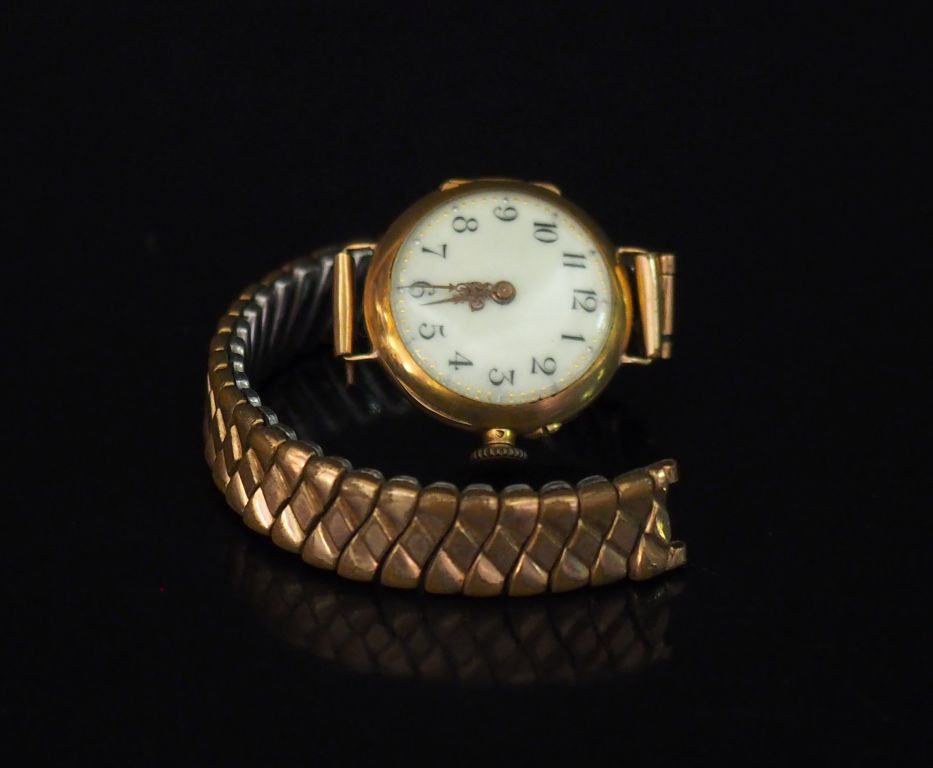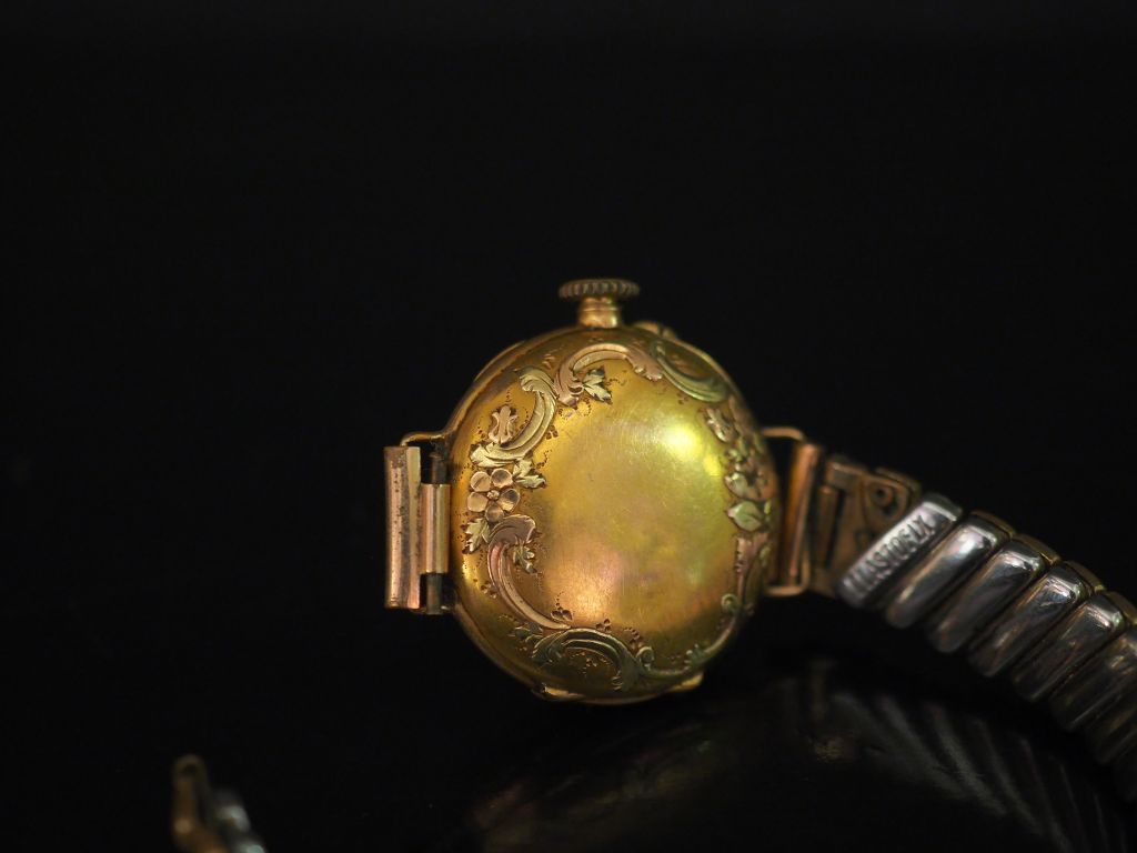 Montre de col transformée en montre bracelet en or jaune. Cadran à chiffres arabes pour les heures. Le revers, à décor de fleurs et rinceaux. Double fonds en or jaune. Bracelet en plaque or. Diam. 27 mm Poids tel. 15 g (environ) (bracelet accidenté)