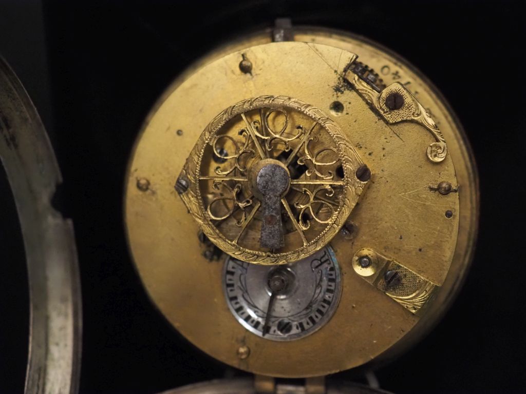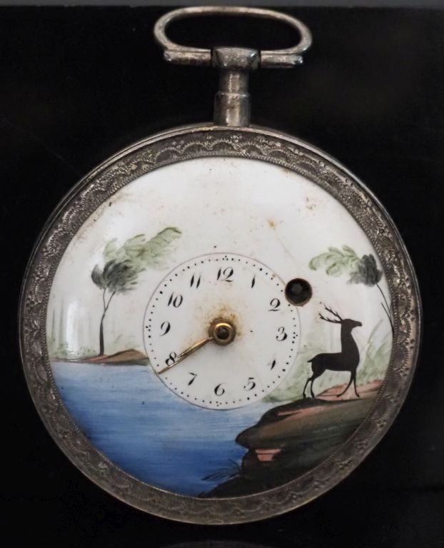 Montre de gousset à coq en argent début XIXème. Cadran, à décor émaillé polychrome d'un paysage lacustre et d'un cerf. Chiffres arabes pour les heures. Diam. 55 mm Poids tel. 96,40 g (manque le verre, manques au niveau des aiguilles et petits accidents au cadran)