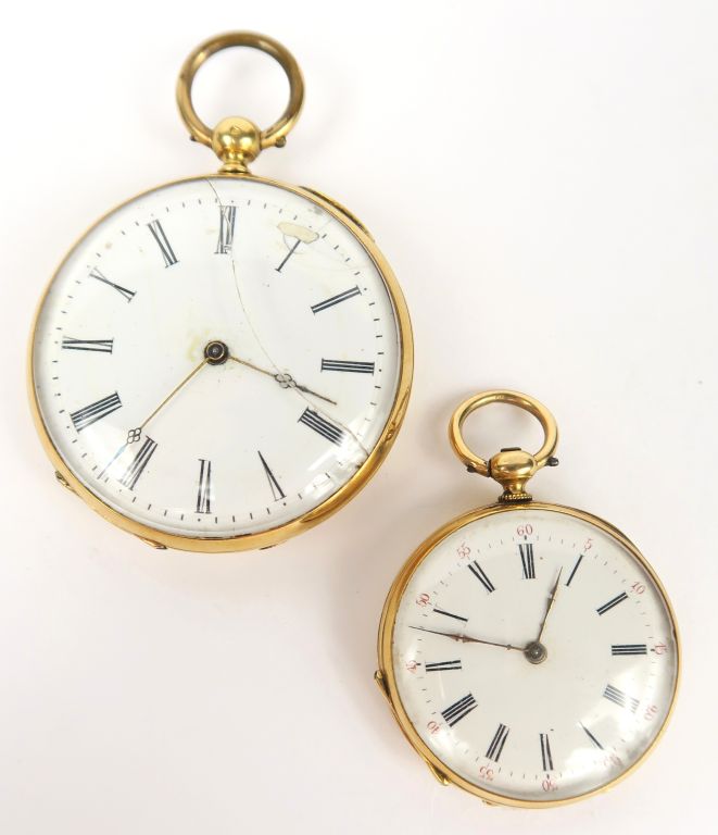 Montre de gousset, cadran accidenté, et montre de col en or émaillé. Poids tel : 79,7 g