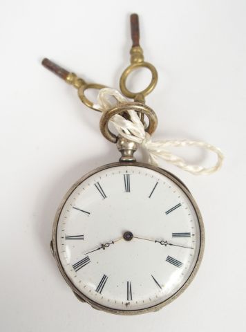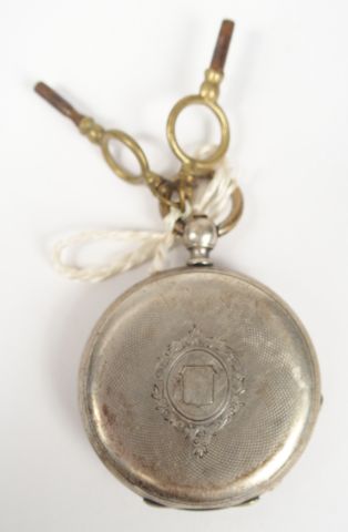 Montre de gousset en argent, cadran émail, chiffres romains, décor gravé de blason. Diam. : 38mm Poids tel: 41,4gr