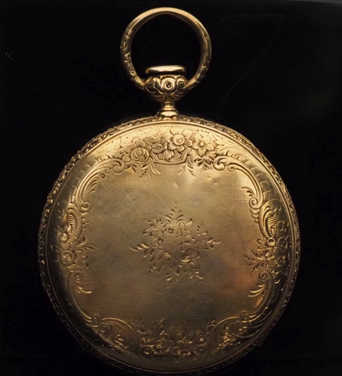 Montre de gousset en or jaune 750. Cadran à chiffres romains pour les heures. Le revers, de fleurettes. Le pourtour agrémenté de rinceaux. Double fonds en or jaune 750. Diam. 50 mm Poids tel. 79,09 g (petits cheveux au cadran)