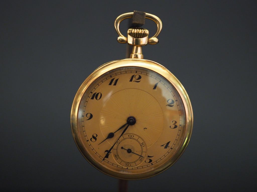 Montre de gousset en or jaune. Cadran à chiffres arabes pour les heures. Compteur pour les secondes à 6h. Double fonds en or jaune. Diam. 42 mm Poids tel. 46,21 g