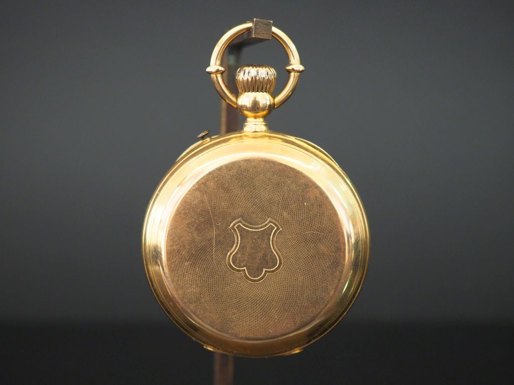Montre de gousset en or jaune. Cadran à chiffres romains pour les heures et arabes pour les minutes. Compteur pour les secondes à 6h. Le revers, à décor de cartouche. Double fonds en or. Diam. 48 mm Poids tel. 87,71 g