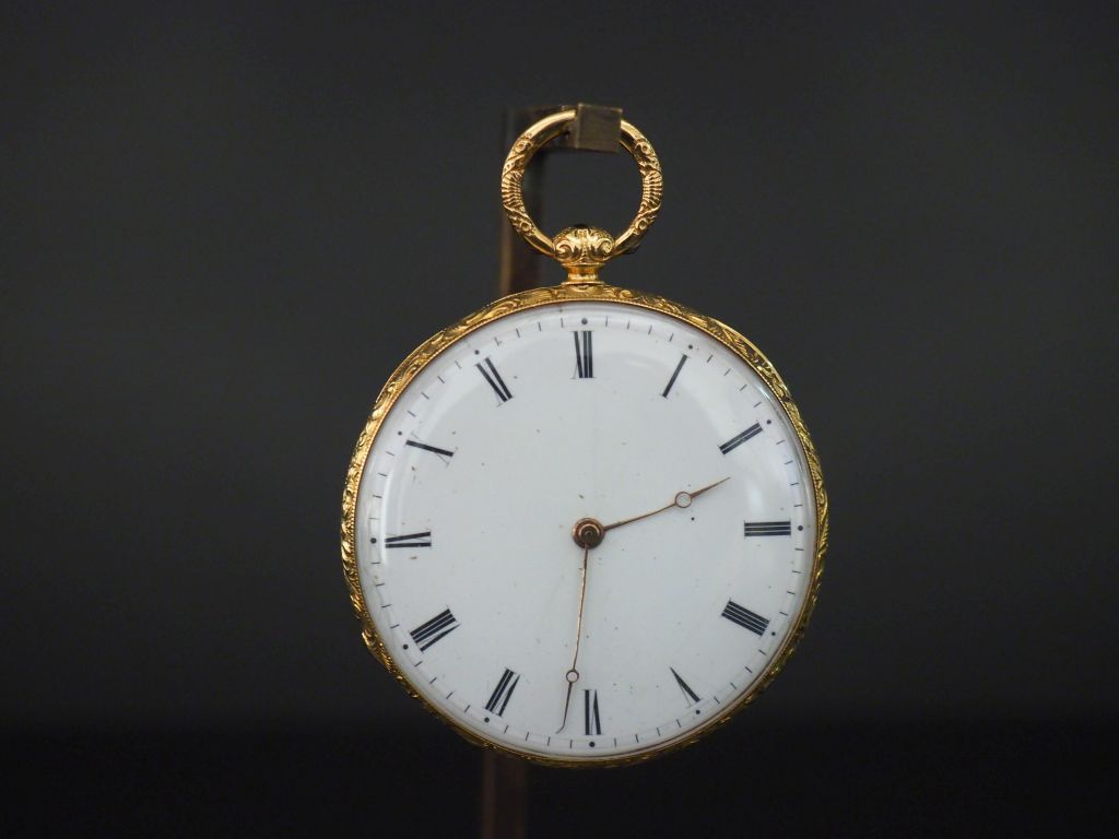 Montre de gousset en or jaune. Cadran à chiffres romains pour les heures. Le portour, à décor de rinceaux feuillagés. Le revers, à décor d'un bouquet de fleurs. Double fonds en or. Diam. 44 mm Poids tel. 46,58
