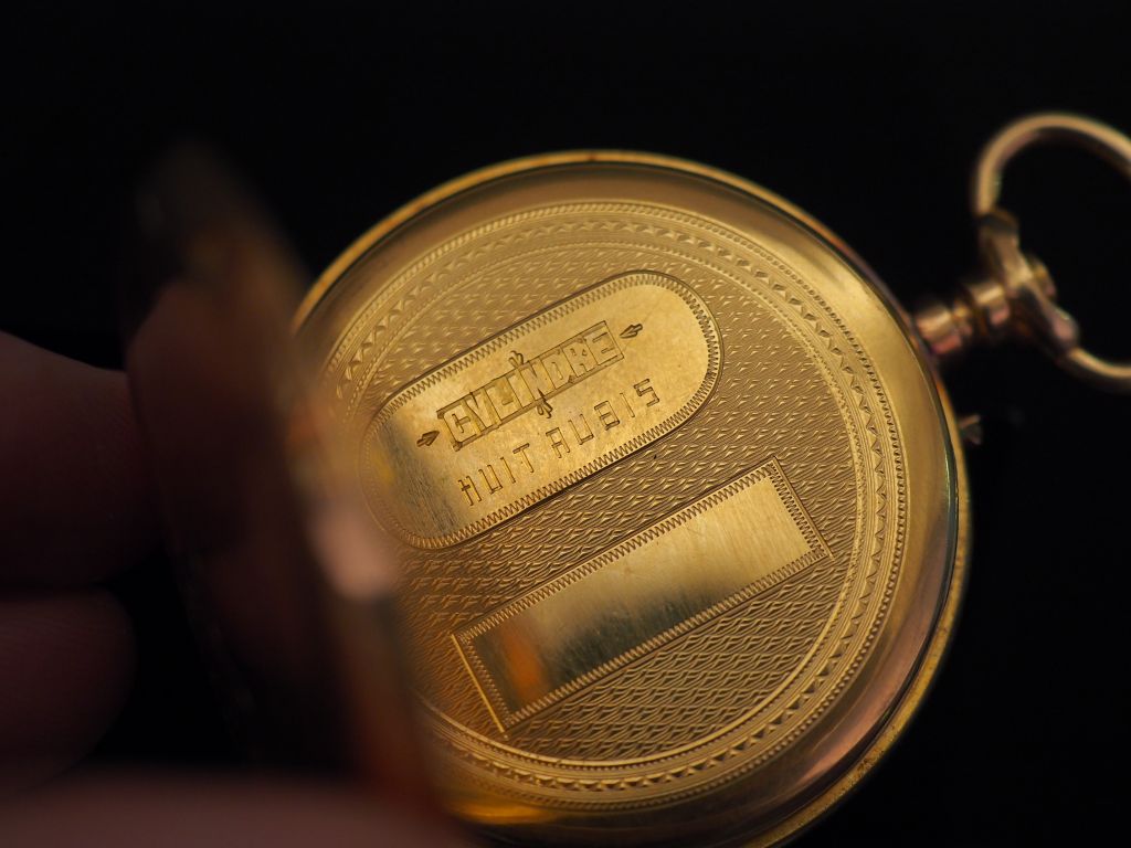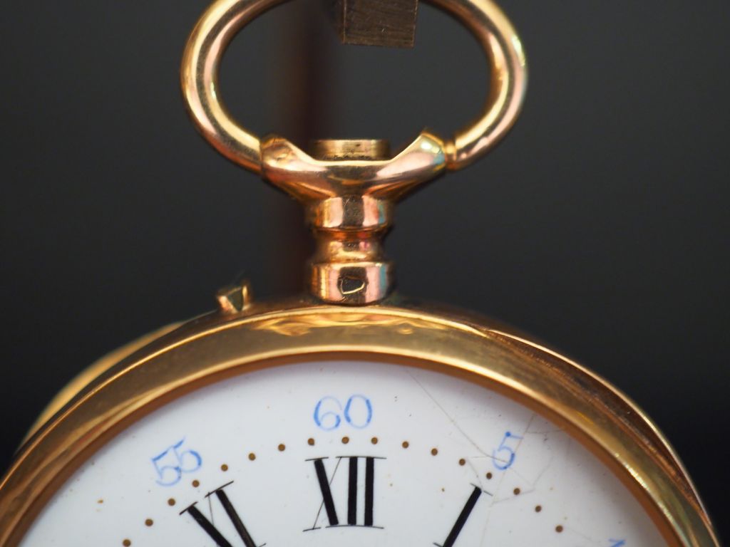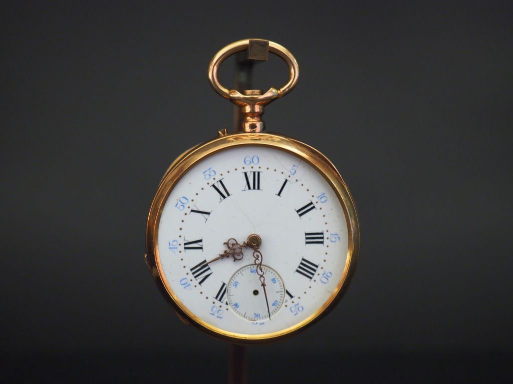 Montre de gousset en or jaune. Cadran à chiffres romains pour les heures et arabes pour les minutes. Compteur pour les secondes à 6h heures. Le revers, à décor de cartouche, branchages et rinceaux. Double fonds en or jaune. Diam. 45 mm Poids tel. (sans le verre) : 63,68 g (verre à refixer, manque l'aiguille pour les secondes et la couronne de remontoir)