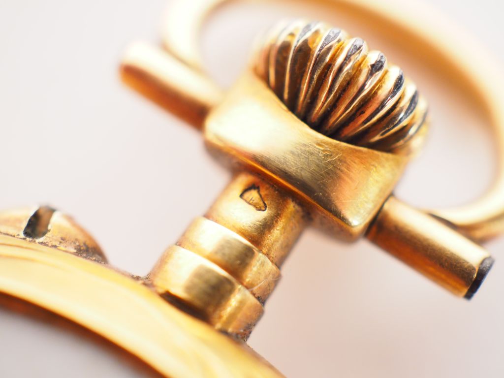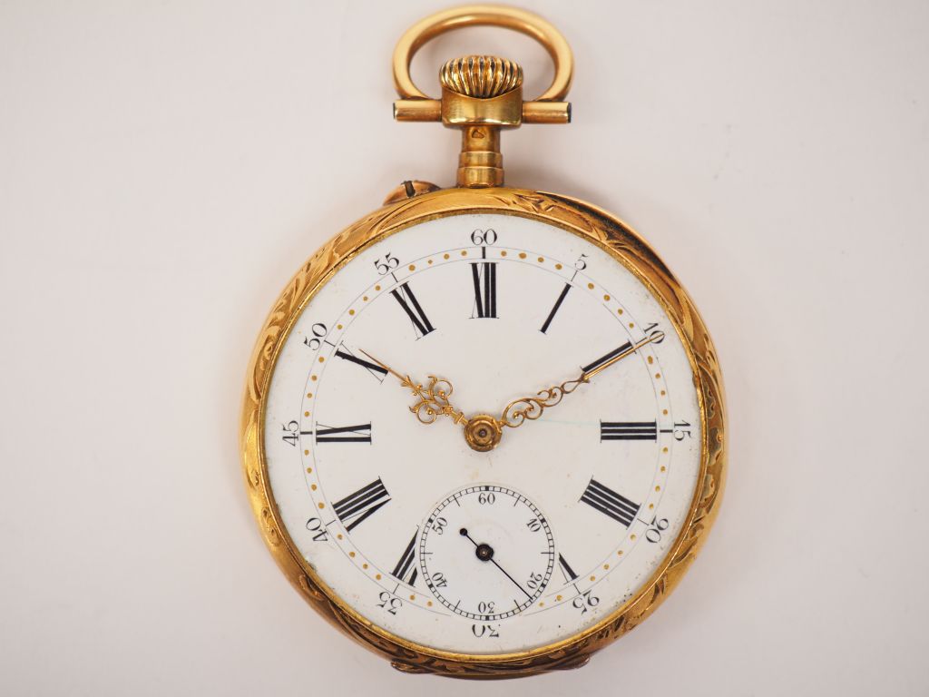 Montre de gousset en or jaune. Cadran blanc à chiffres arabes pour les minutes et romains pour les heures. Le revers, à décor de feuillage. Poids tel. 56,90 g (manque le verre)