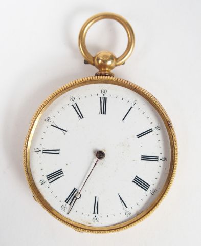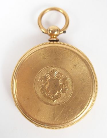Montre de gousset en or jaune, cadran émail, chiffres romains, décor de blason (manque verre, en l'état). Diam. : 40mm Poids tel: 50,9gr