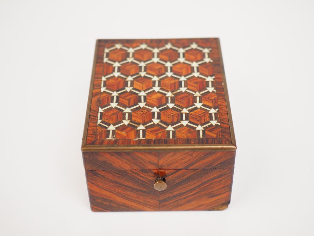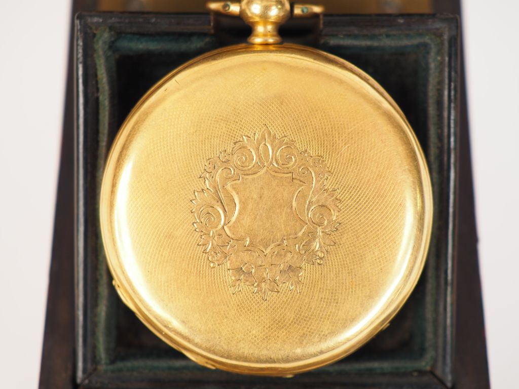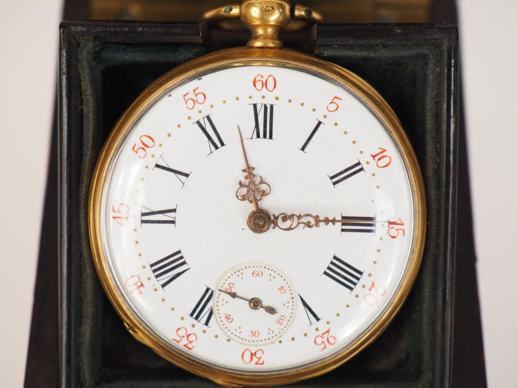 Montre de gousset en or jaune. Cadran émaillé blanc à chiffres arabes pour les minutes et chiffres romains pour les heures. Compteur des secondes à 6 heures. Le revers du boitier à décor de cartouche. Poids tel. 61,04 g Dans un porte-montre en marqueterie signé Tahan.