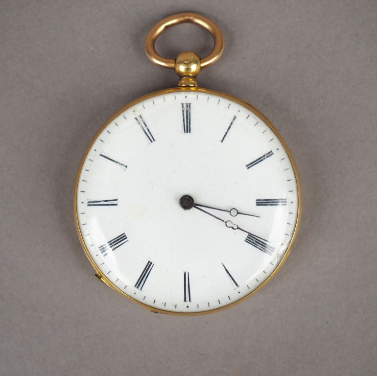 Montre de gousset en or jaune, cadran émaillé, chiffres romains. Le revers à décor de fleurs dans un cartouche. Diam. 42 mm Poids tel. 51,30 g (cuvette en métal)