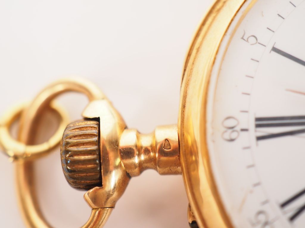 Montre de gousset en or jaune et giletière en or jaune. Cadran blanc à chiffres arabes pour les mintures et romains pour les heures. Poids tel. 104 g