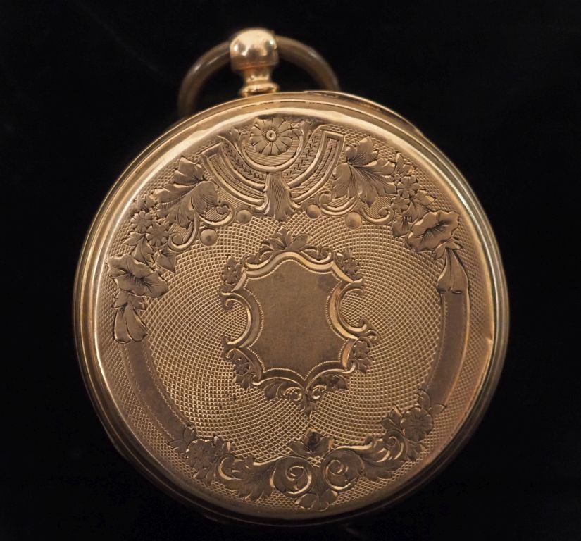 Montre de gousset Napoléon III en or jaune 750. Cadran à chiffres arabes pour les heures et arabes pour les minutes. Le revers, à décor de guirlandes de feuillages et de fleurs, rinceaux et cartouche. Double fonds et bélière en métal. Diam. 45 mm Poids tel. 54,65 g (petites traces de soudure anciennes)