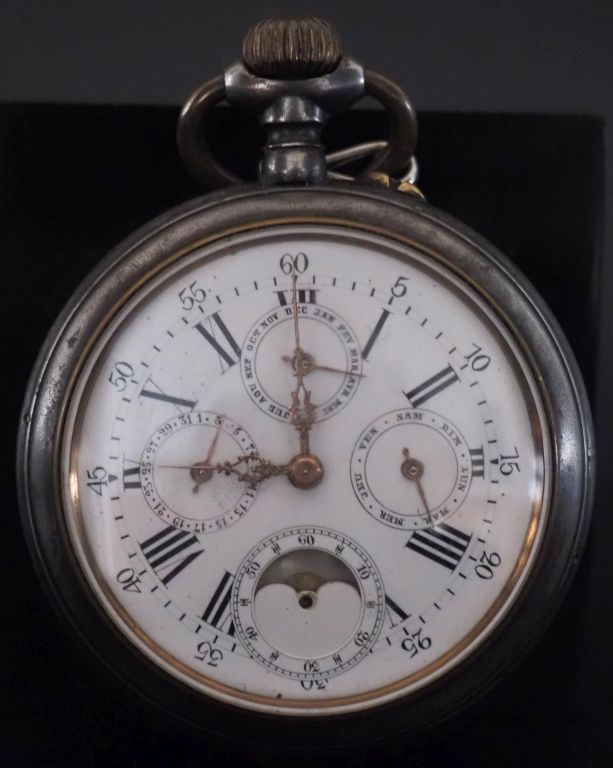 Montre de gousset régulateur à calendrier et phases de la lune en acier. Cadran à chiffres romains pour les heures et arabes pour les minutes. Diam. 65 mm