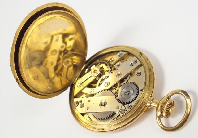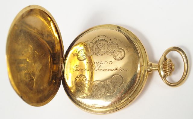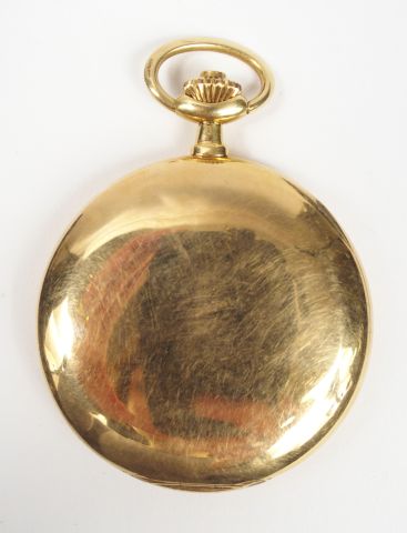 MOVADO. Montre savonnette en or jaune, cadran acier, chiffres romains, trotteuse (manque verre et petite aiguille). Diam. : 48mm Poids tel: 64,8gr