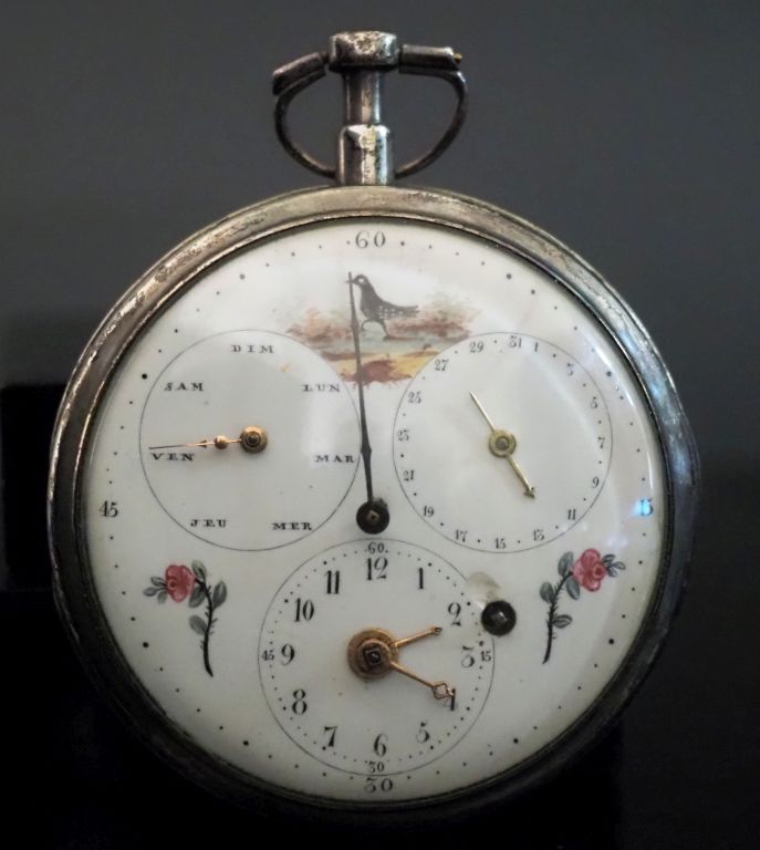 MS PY, à Travers Début XIXe siècle Montre de gousset en argent avec double quantième Boîtier : rond sur charnière, le dos lisse, la lunette simple sur charnière (usures) Cadran : émail polychrome avec indication des jours de la semaine et de la date, aiguille centrale de type cadran régulateur, le cadran des heures et minutes excentré, carré de remontage (accidents) Mouvement : mécanique avec remontage à clef, coq ciselé et percé, balancier spiral, signature sur la platine Diam. 60 mm Poids tel. 125 g (petits accidents) Expert : Geoffroy Ader - Ader Watches