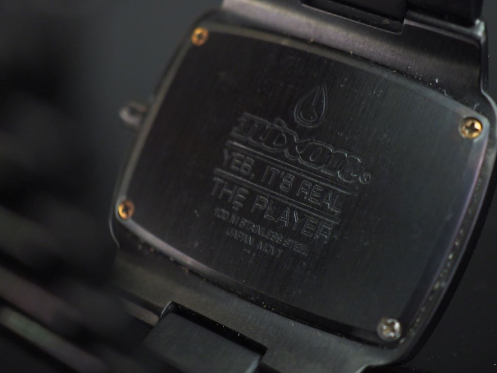 NIXON, Montre bracelet en acier noir. Cadran rectangulaire à fond noir agrémenté d'un strass. Bracelet articulé à boucle déployante. Signée. 30 x 40 mm (petite usure au verre)