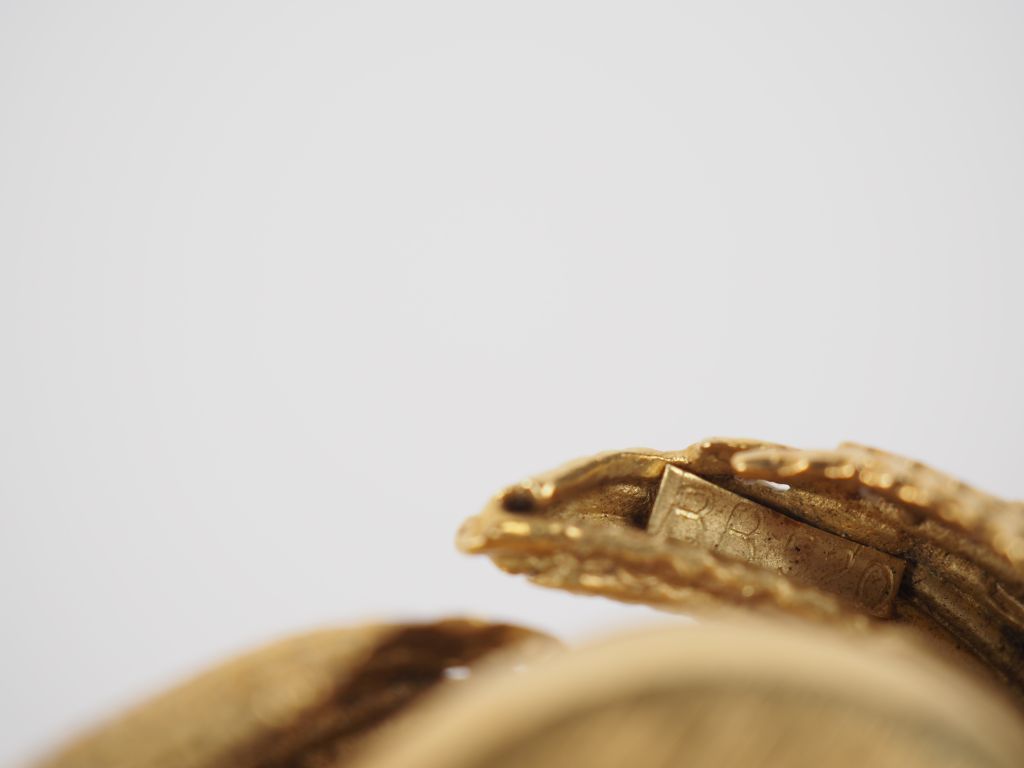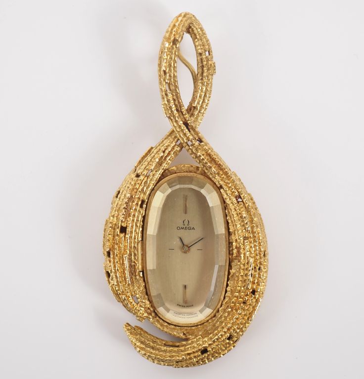 OMEGA / Andrew GRIMA Pendentif mouvementé en or jaune 750 en forme de goutte, agrémenté en son centre d'une montre ovale à verre facetté. Cadran à index bâtons sur fond champagne signé OMEGA. Mouvement mécanique. Le pendentif signé A. GRIMA et numéroté BB520. 8,5 x 3,5 cm Poids tel. 50,56 g