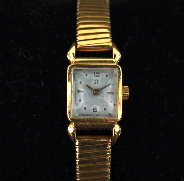 OMEGA (?), Montre bracelet de dame, boitier et bracelet en or jaune 750. Cadran rectangulaire à chiffres arabes et pastilles pour les heures. Bracelet articulé en chute, maille dite "tubogaze". Poids tel. 26,26 g