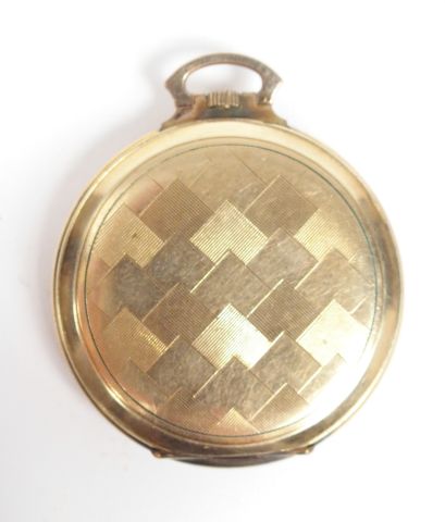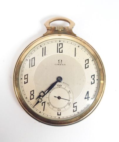 OMEGA. Montre de gousset plate en métal doré, cadran acier brossé, chiffres arabes, chronomètre. Diam. : 48mm