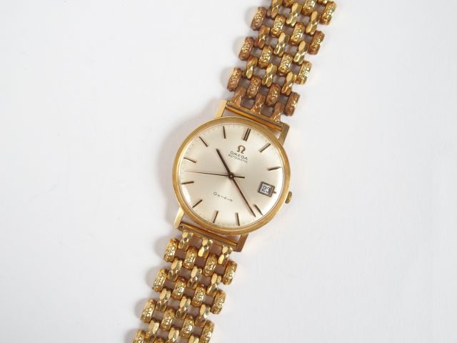 OMEGA. Montre mixte, boitier rond et bracelet en or jaune, indication des jours. 20cm environ Poids tel: 78,3gr