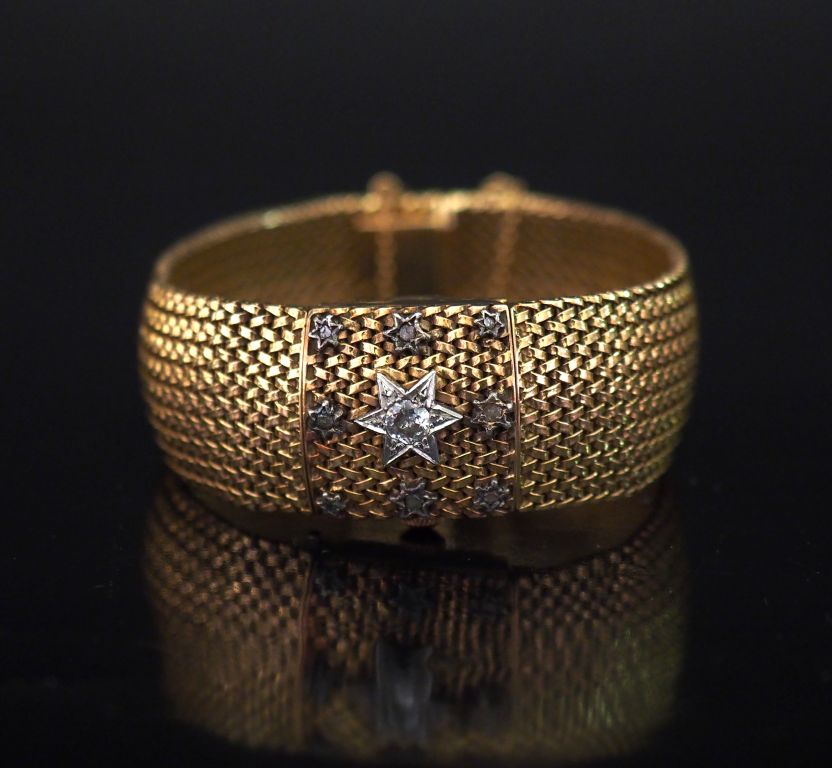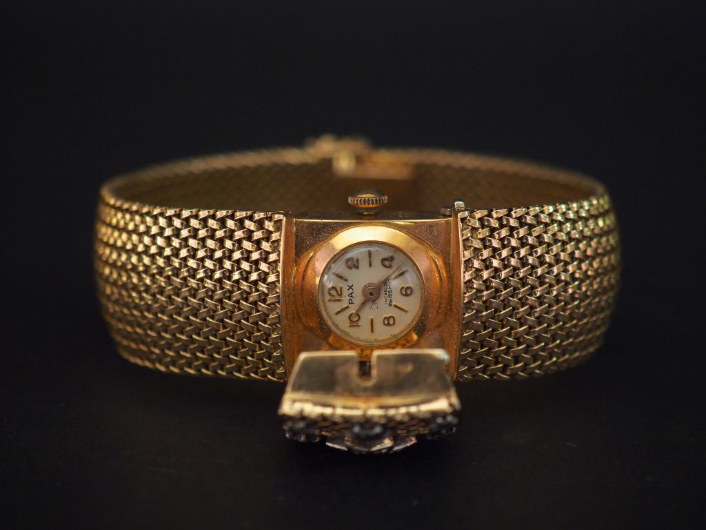 PAX Bracelet montre à secret en or jaune. Cadran rond à index bâtons et chiffres arabes pour les heures. Le cache, à décor d'étoiles serties de diamants. Bracelet articulé maille plate tressée. Chainette de sécurité. Larg. du bracelet : 2 cm Poids tel. 69,61 g Vendue en l'état