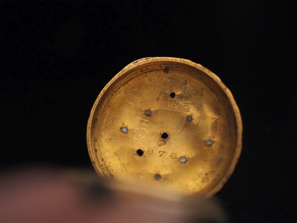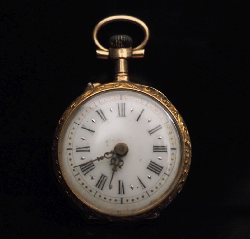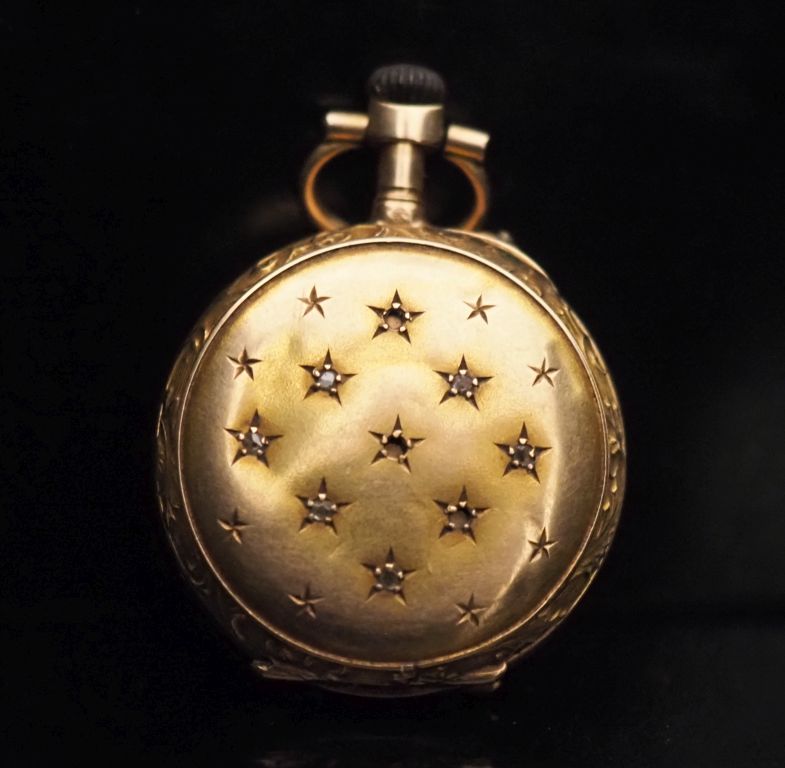 Petite montre de col en or jaune 750. Cadran à chiffres romains pour les heures. Le revers, à décor d'étoiles pour certaines serties d'éclats à l'imitation du diamant. Le pourtour, à décor de rinceaux. Double fonds en or jaune 750. Diam. 25 mm Poids tel. 12,46 g (petits manques, couronne de remontoir en métal)