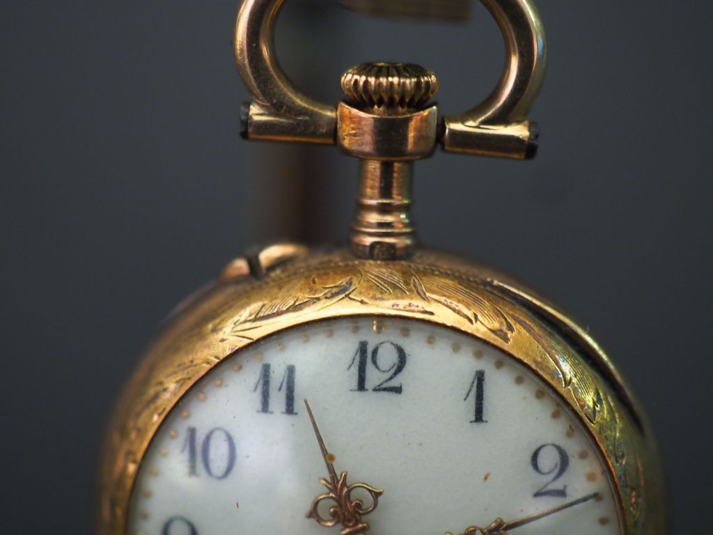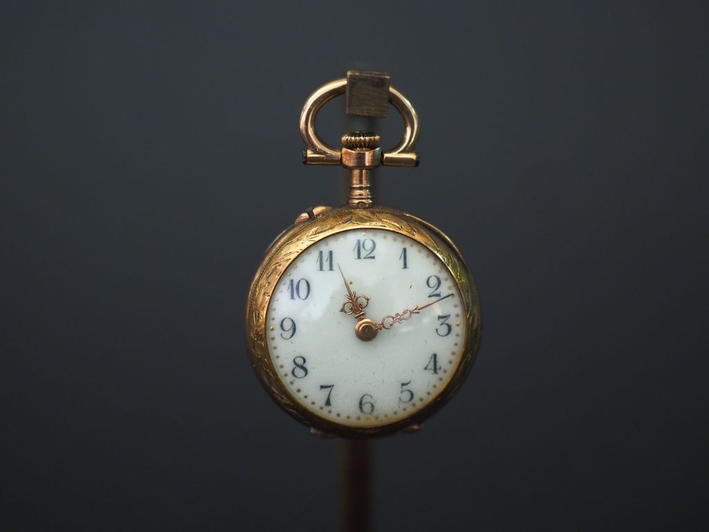 Petite montre de col en or jaune. Cadran à chiffres arabes pour les heures. Le revers, à décor de fleurs et de monogramme. Diam. 2,4 cm Poids tel. 12,35 g