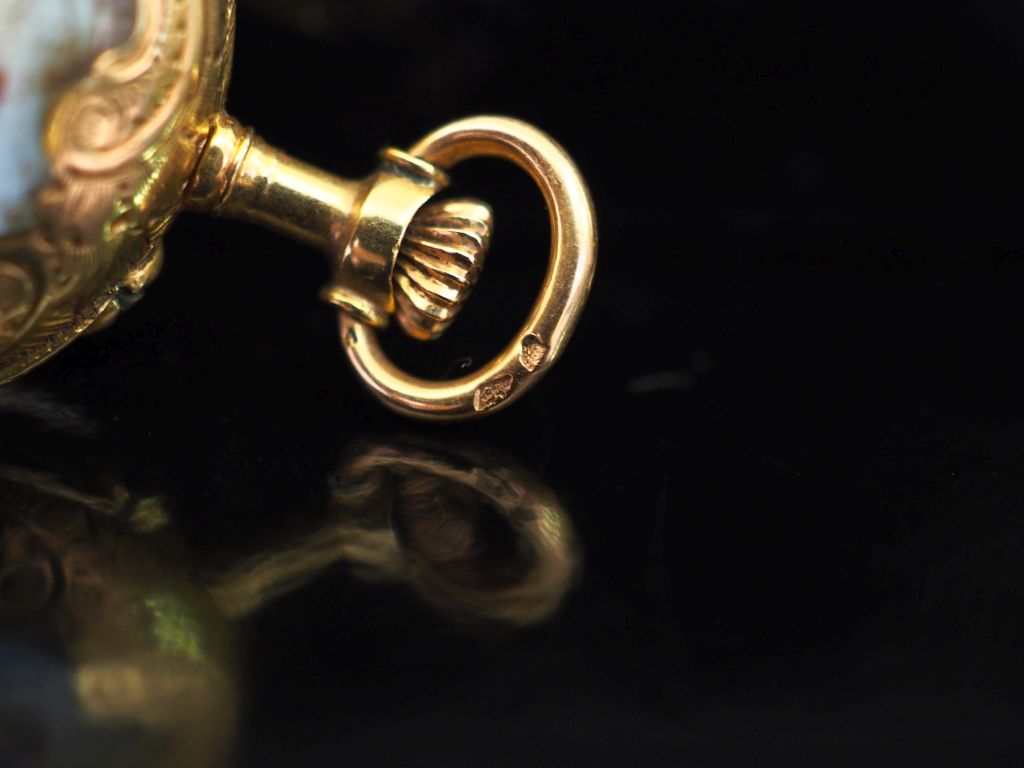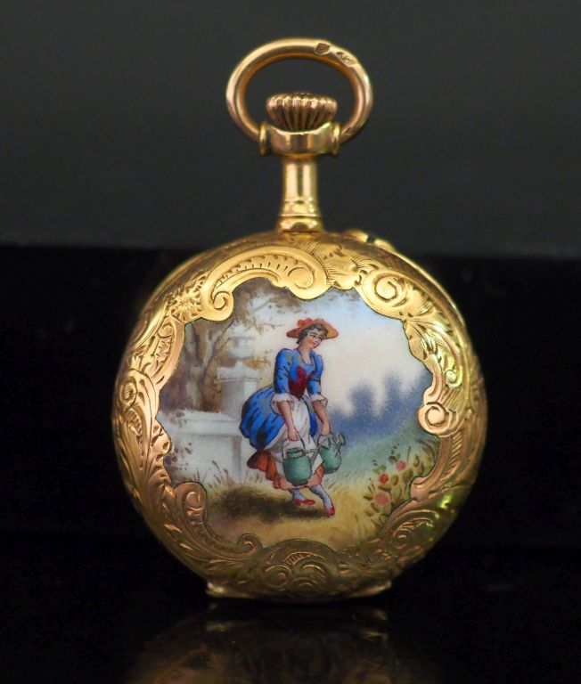 Petite montre de col Napoléon III de style Louis XVI en or jaune 750. Cadran rond à chiffres arabes pour les heures. Le revers, à décor polychrome d'une jeune élégante aux arrosoirs. Le pourtour, à décor de rinceaux. Double fonds en or jaune 750. Diam. 25 mm Poids tel. 12,87 g