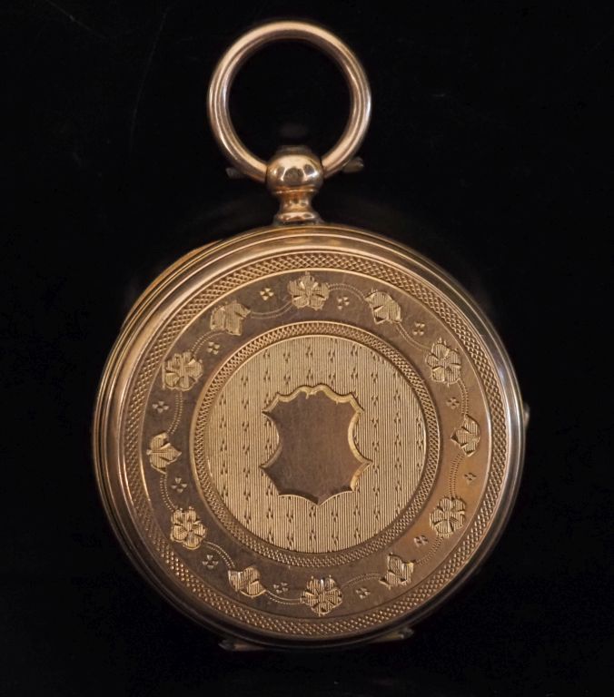 Petite montre de col Napoléon III en or jaune 750. Cadran à chiffres romains pour les heures et arabes pour les minutes. Le revers, à décor de cartouche et guirlnde de fleurettes. Double fonds en métal. Diam. 33 mm Poids tel. 24,02 g