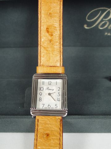 POIRAY, "Ma Première, Grand Modèle". Montre dame, cadran acier à décor de godrons, chiffres arabes, mouvement à quartz, bracelet cuir autruche kamel. Dans son écrin d'origine, accompagné de son certificat. Neuve.