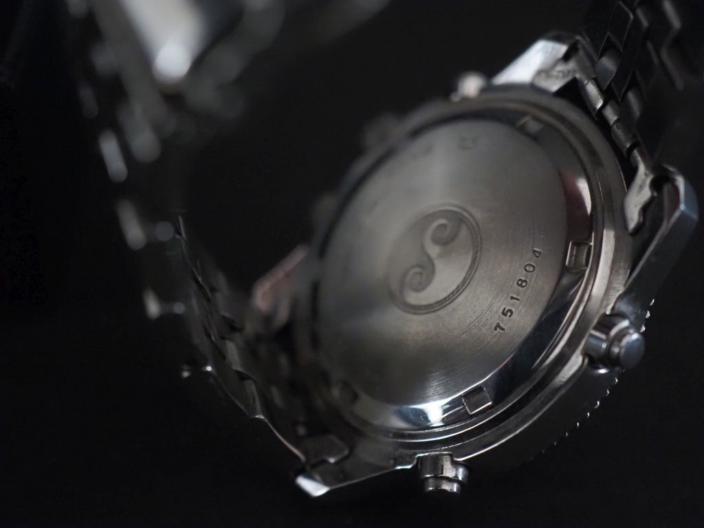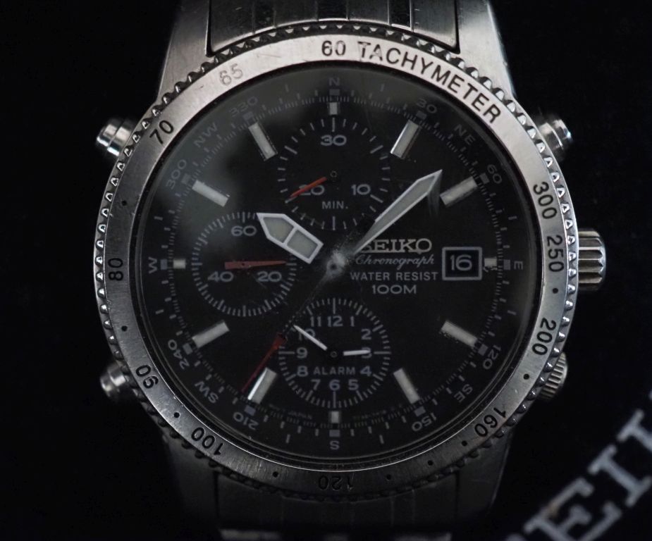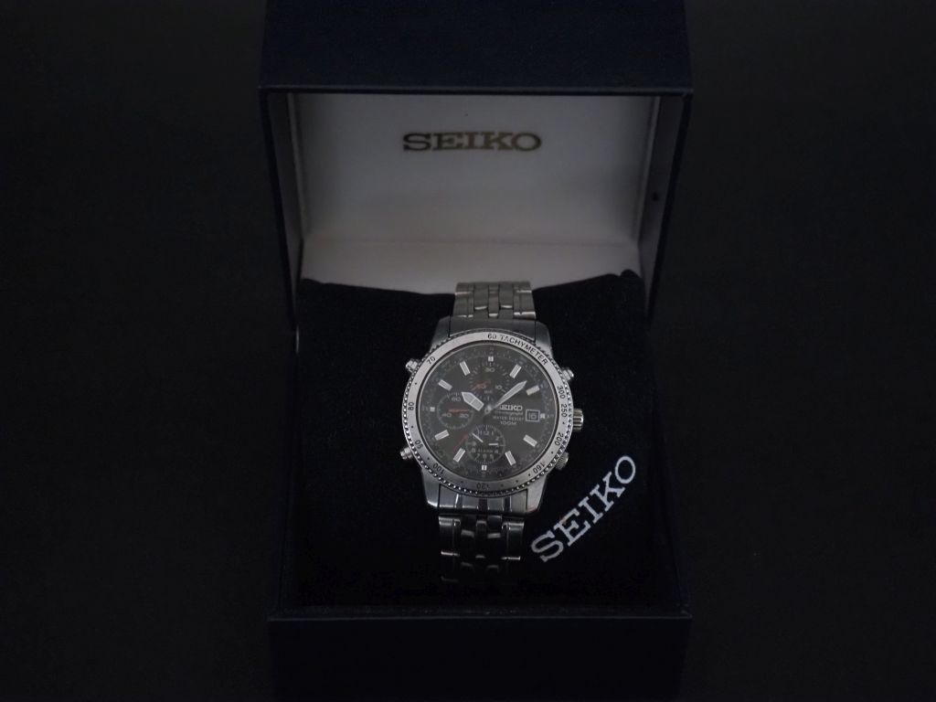 SEIKO, Chronograph Ref. 7T32-7E60 Montre bracelet en acier. Cadran rond à trois compteurs sur fond noir, index appliqués et aiguilles luminescents. Bracelet articulé en acier, boucle déployante. Signée. Diam. 41 mm Dans sa boite, avec son certificat d'authenticité. (usures)