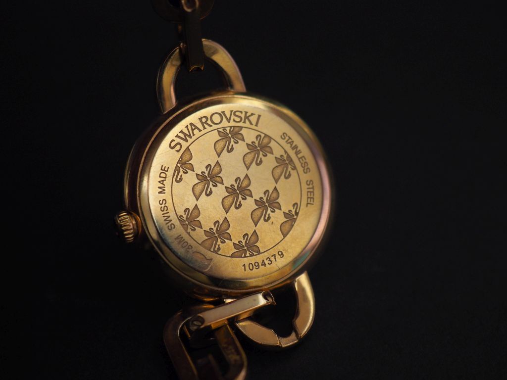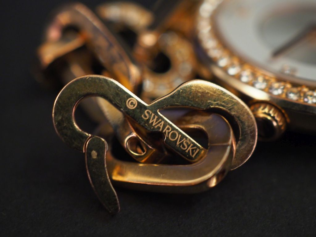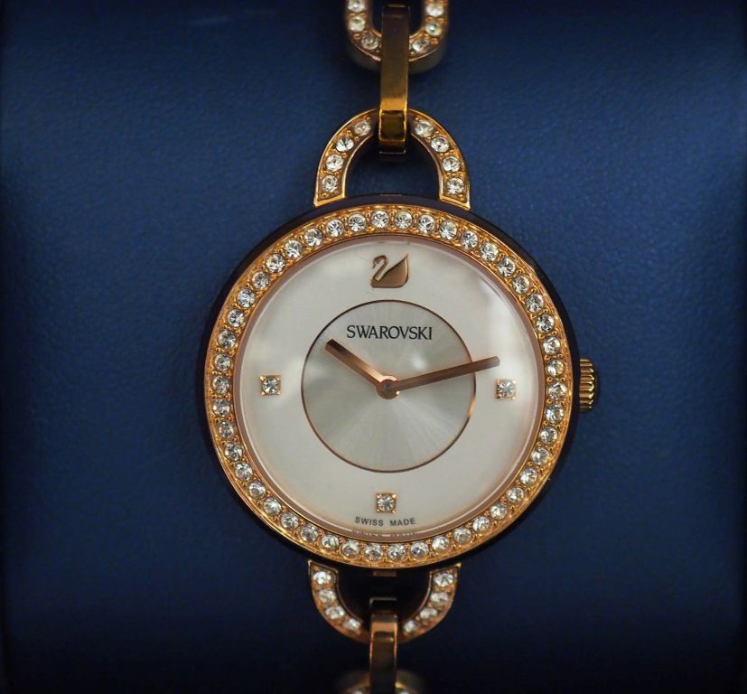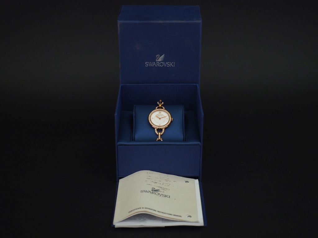 SWAROVSKI Montre bracelet de dame en métal doré, rehaussé sur le cadran et le bracelet de cristaux brillants facettés. Cadran rond. Bracelet souple, maille forçat. Mouvement à quartz. Signée. Dans son écrin. (maillons supplémentaires)